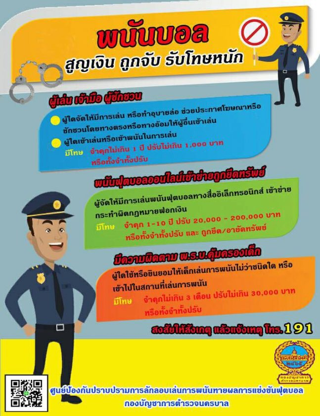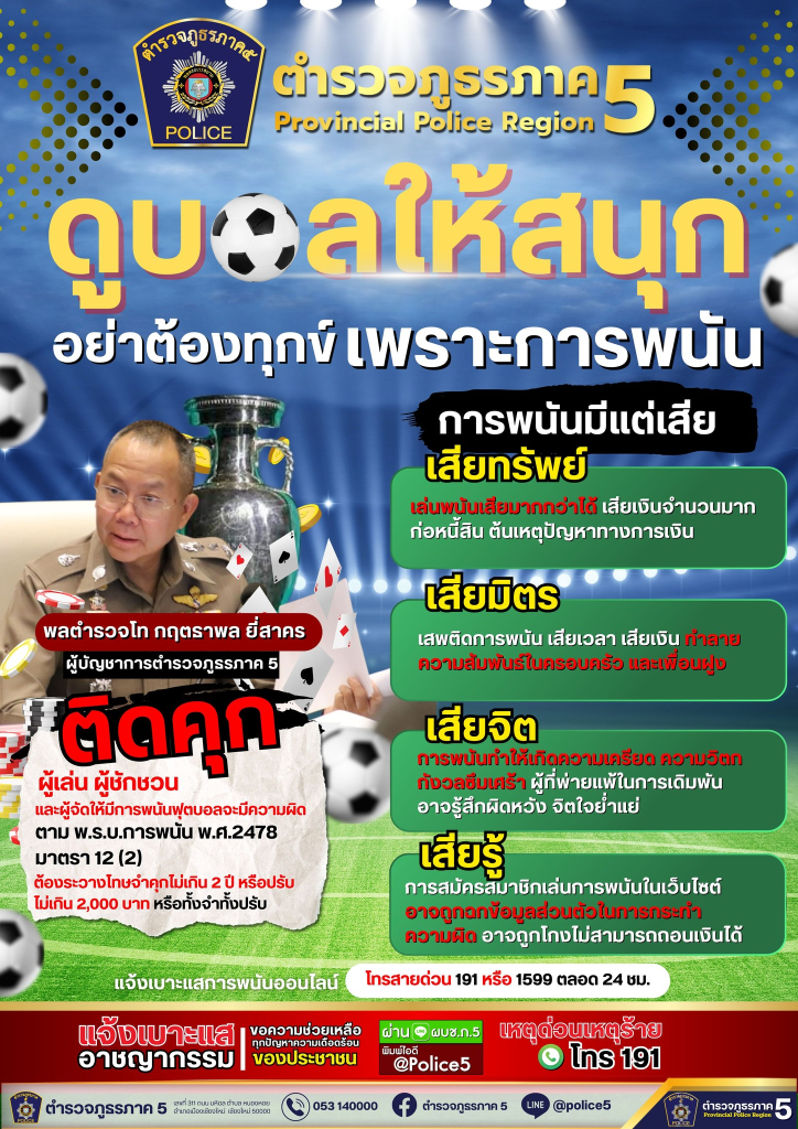 สถานีตำรวจภูธรเชียงแสนประชาสัมพันธ์พี่น้องประชาชนรับชมการแข่งขันฟุตบอลอย่างสร้างสรรค์ อย่าหลงผิดไปเล่นพนันฟุตบอล เพราะผลเสียที่จะตามมานั้นมีมากมาย เช่น