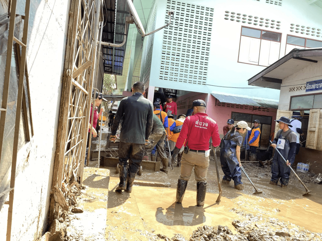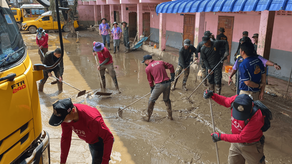 พ.ต.อ.ถนัด ชุ่มมะโน ผกก.สภ.เชียงแสน มอบหมายให้ พ.ต.ต.เฉลา พงษ์ประยูร สวปฯและตำรวจจิตอาสา สภ.เชียงแสน เข้าไปช่วยเหลือ เอาดินเลนออกจากโรงเรียนไม้ลุงขน อำเภอแม่สาย จังหวัดเชียงราย โดยทำงานร่วมกับ ทหาร ชลประทาน ประชาชน ในพื้นที่ เมื่อวันที่ 10 ตุลาคม 2567